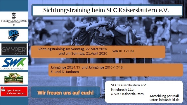Der SFC Kaiserslautern möchte euch wieder zum Sichtungstraining auf seinem Gelände, Kniebrech 11a, 67657 Kaiserslautern einladen.